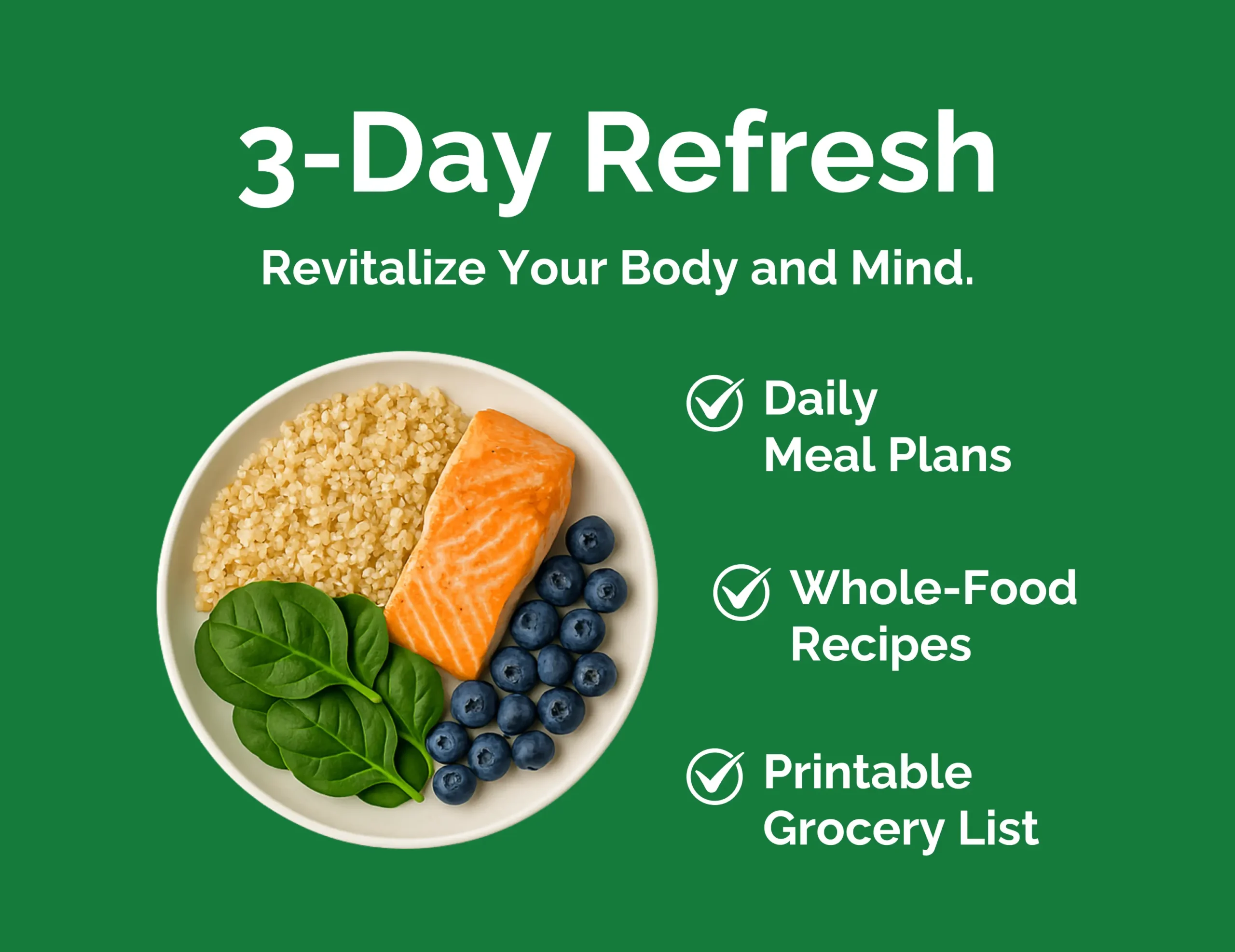 Kickstart your journey to better health with our 3-Day Refresh plan. This comprehensive program is designed to revitalize your body and mind through balanced, nutritious meals. Perfect for anyone looking to reset their eating habits, this plan integrates a variety of whole foods to stabilize blood sugar, reduce toxins, and improve overall well-being.